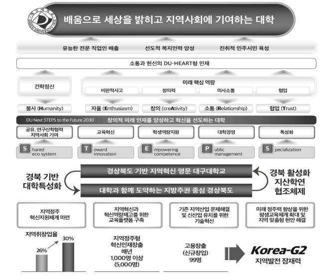 - 기술혁신과 공동체 가치실현으로 지역의 지속가능성 제고 경북의 8대 사업과 정합성이 높은 DU-RISE사업의 운영을 통해 지역-기업-대학의 상생발전을 도모하여 혁신적 인간과 미래 기술혁신을 담아 Korea-G2를 달성하고 경상북도의 미래 비전을 제시하는 전략목표 설정